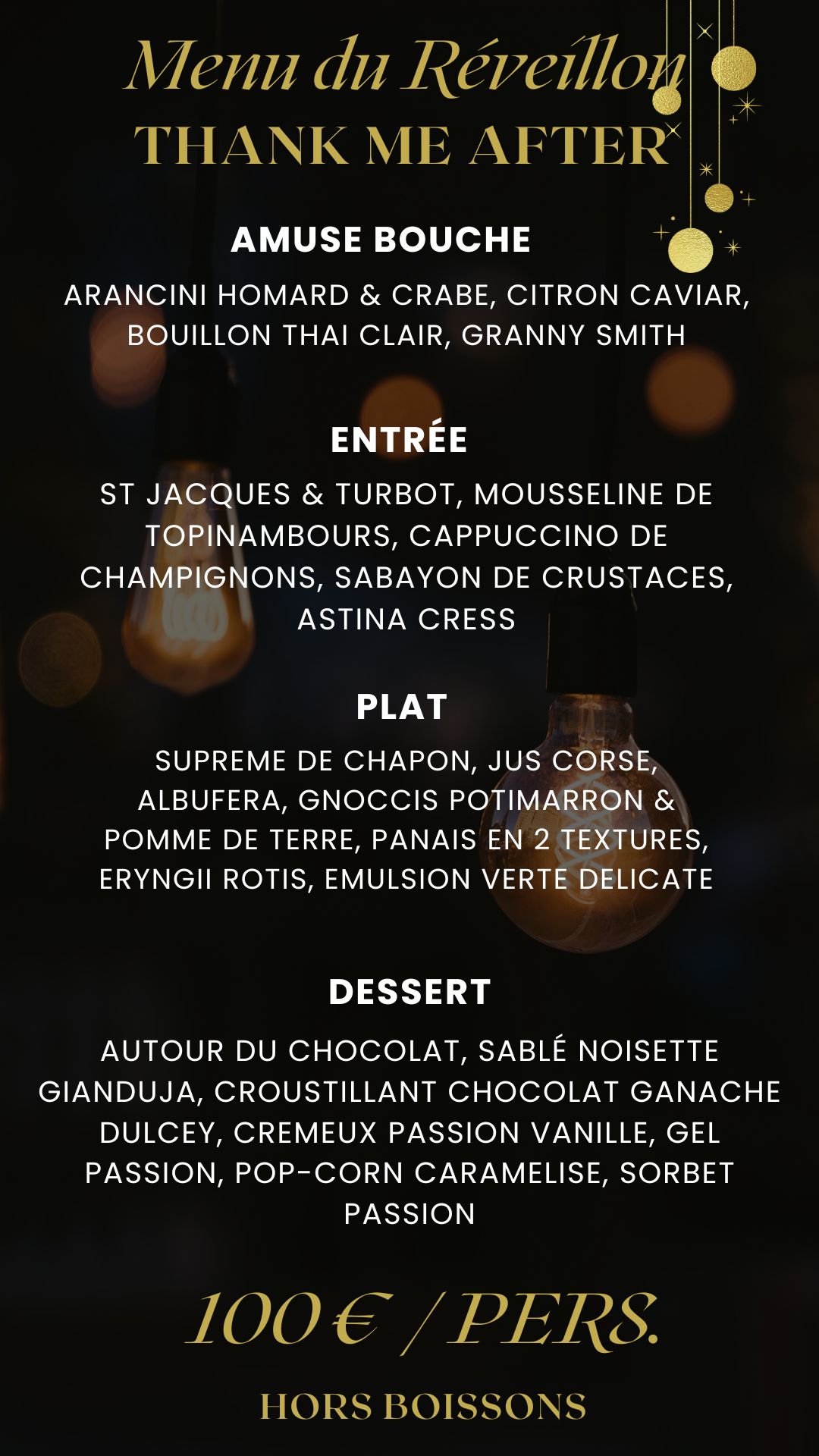 Thank Me After, est un restaurant gastronomique Halal à Lyon, a été créé en 2021 et propose à sa clientèle une cuisine fusion inspirée de saveurs et de techniques des coins du monde (Méditerranéen, Moyen-Orient, Asie, Amérique).